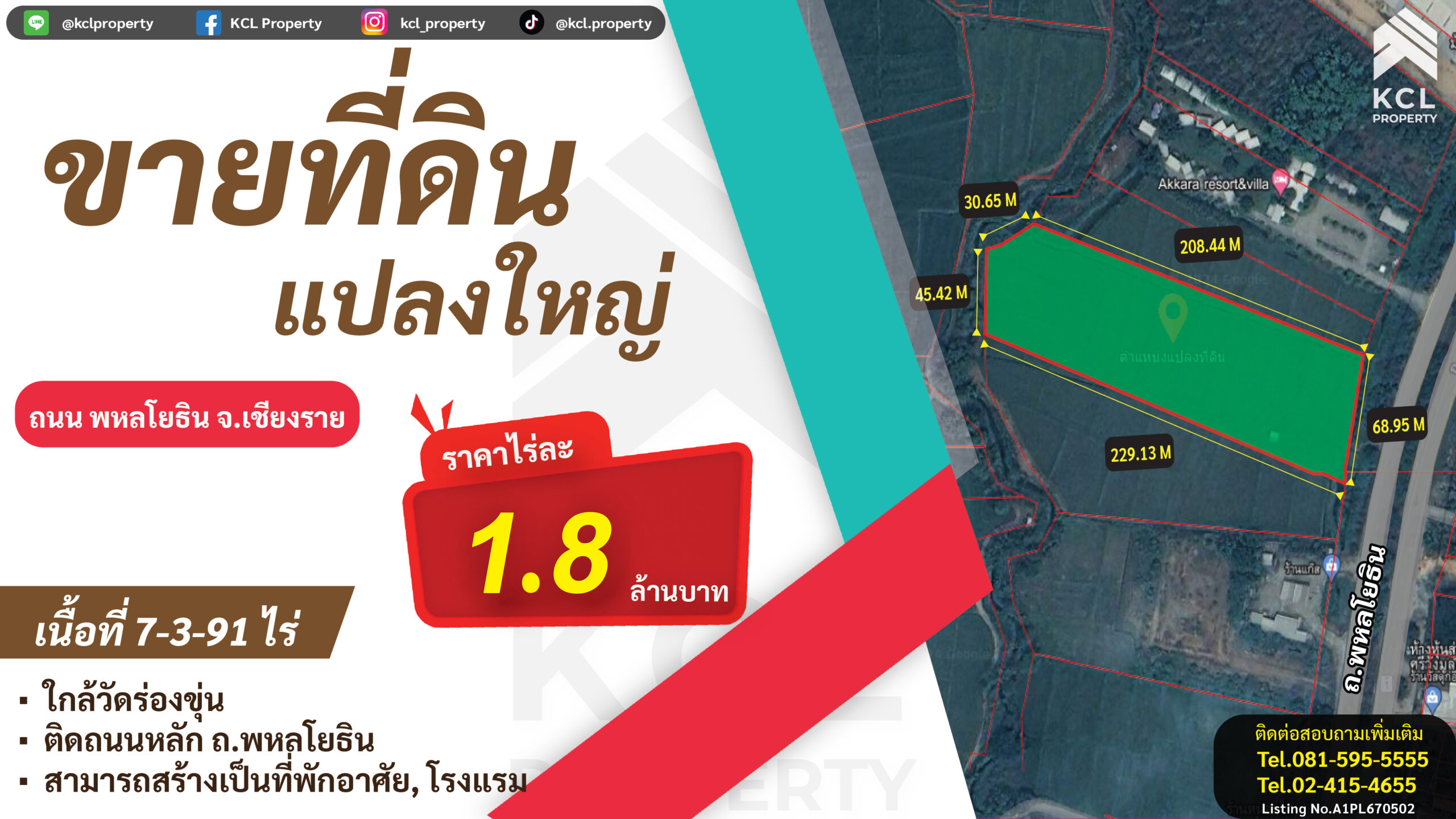 ขายที่ดิน เนื้อที่ : 7-3-91 ไร่ ที่ดินแปลงสวยติดถ.พหลโยธินใกล้วัดร่องขุ่น เพียง 1.9 กิโลเมตร